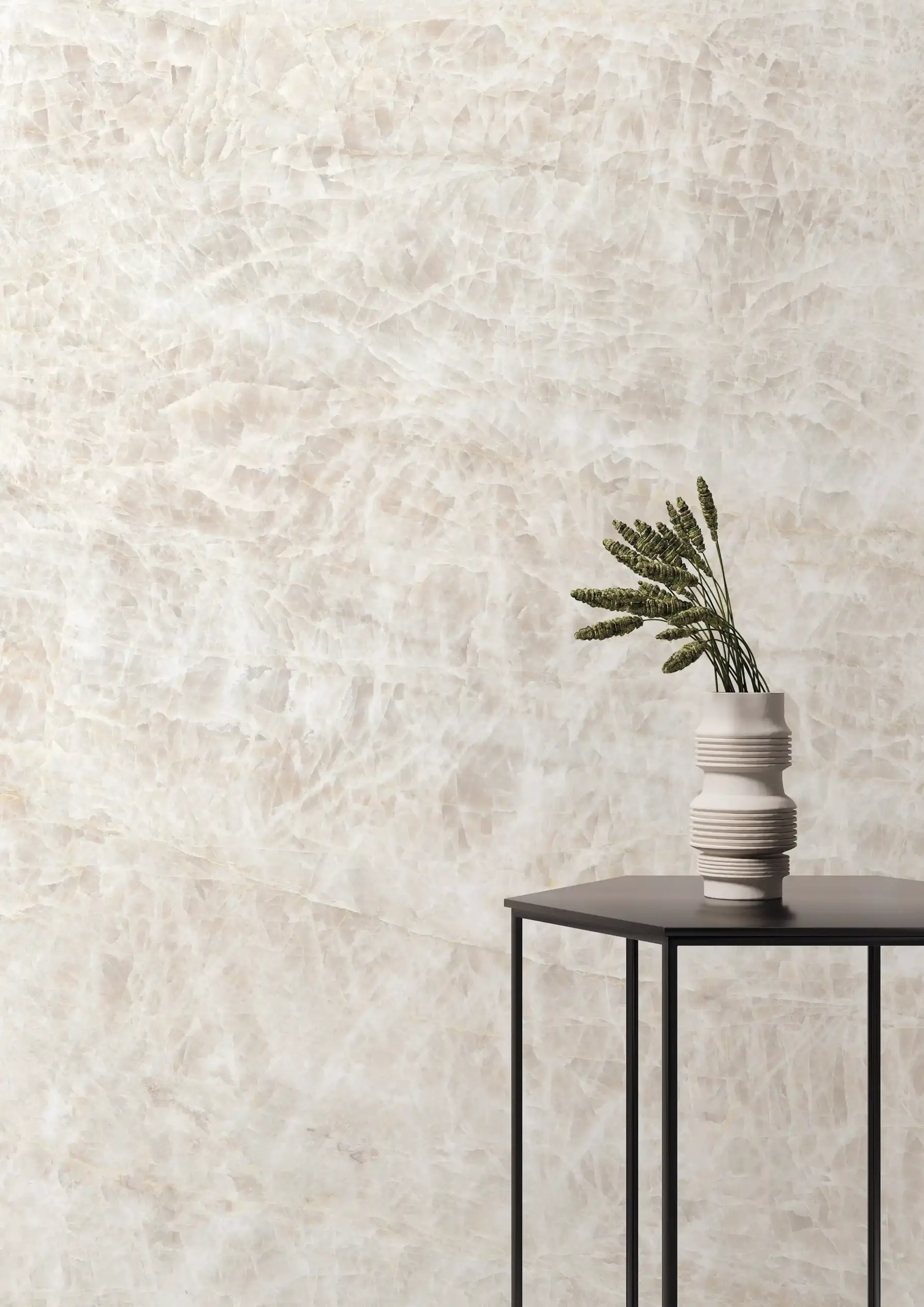 霧面系列 當大眾追求自我品味與華麗的豪宅美學成為潮流的今日,依然有著習慣低調自然的族群,選用經由科技去蕪存菁後所留下乾淨、漂亮大理石紋理的石材,並選用成為裝潢首選,有著天然石材般的石韻搭配細緻霧感質地,少了拋光亮麗的表面,多了來自天然石材於於歲月中堆積出的流線感,與各式層次豐沛的霧面質地紋路,加上霧面因為沒有光澤,顏色也會顯得比較飽滿,紋路比較容易顯現出來,圖像紋理更加明顯,視覺感顏色的部分較溫和,適合輕奢風格的空間氛圍。 SIZE丨 尺寸 324cm x 162cm THICKNESS 丨 厚度 12mm Grain Matching 丨 對紋 是 Surface | 表面 霧面